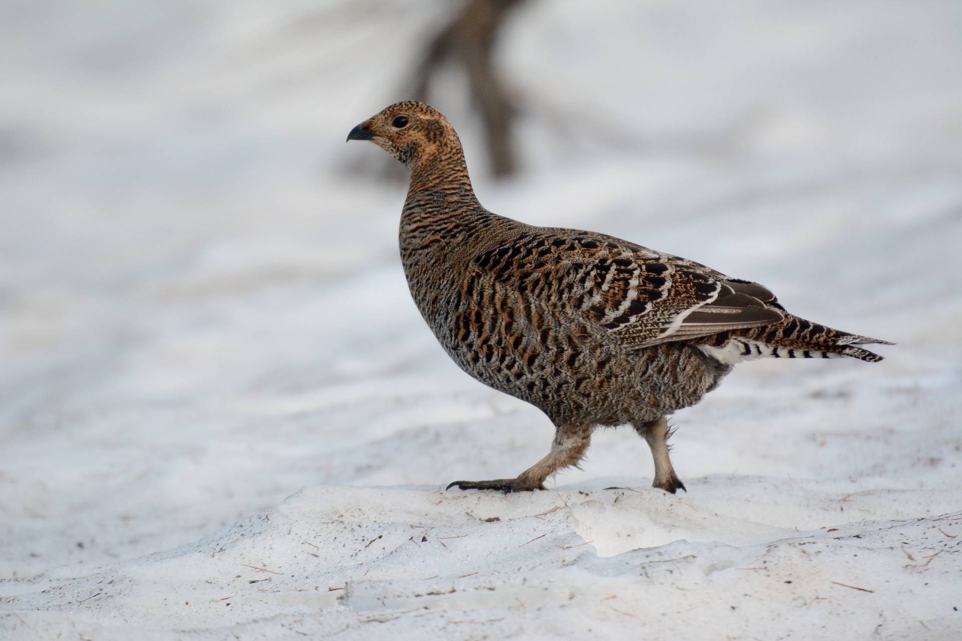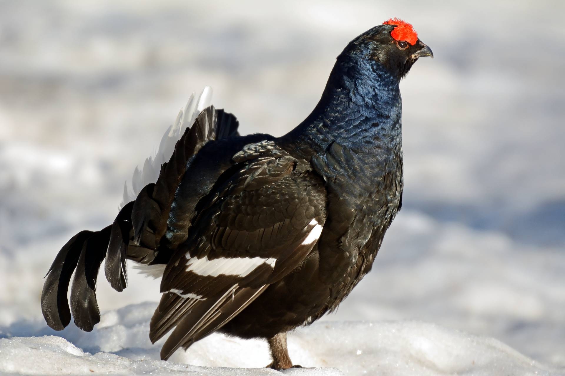 Le tétras lyre, aussi appelé « petit coq de Bruyère » fait partie de la famille des galliformes. D'une taille équivalente à une poule, le mâle possède un plumage noir à reflets bleus. La queue se termine en forme de lyre. La femelle plus discrète s'habille de brun et roux. En hiver, il s'enfonce dans la neige pour éviter le froid nocturne. Il peut passer de longues périodes dans cet igloo s'il fait mauvais temps. - PNE