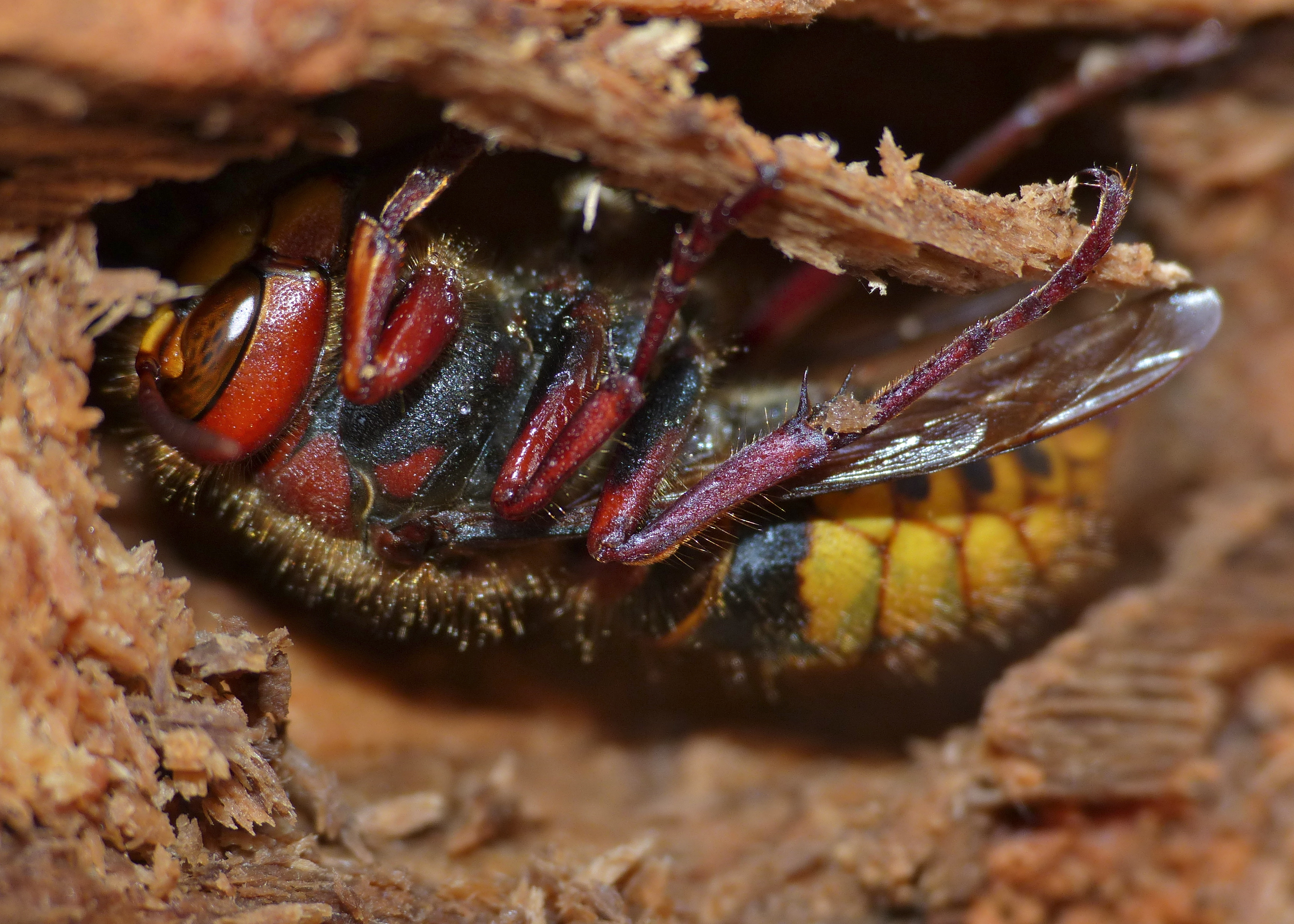 Le frelon est doté d'une bonne vision périphérique et de 3 ocelles bien visibles sur le dessus de la tête, qui en font un très bon chasseur.