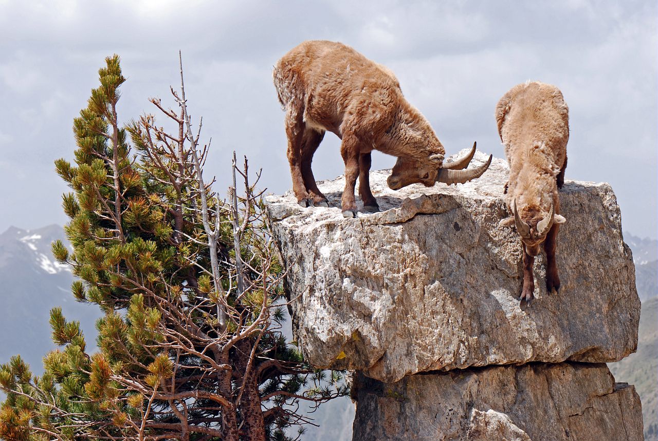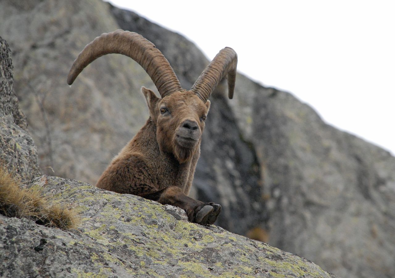 Le bouquetin des Alpes est un ongulé, proche des chèvres domestiques. Cette espèce a failli disparaître au 19 ème siècle. Inféodé aux falaises abruptes, ses onglons souples lui donnent une grande agilité sur le rocher. Mâles et femelles portent des cornes ornées d’anneaux de parure qui poussent durant toute leur vie. Celles des mâles peuvent atteindre un mètre de long. Celles des étagnes (les femelles), plus petites, sont presque droites. - PNE